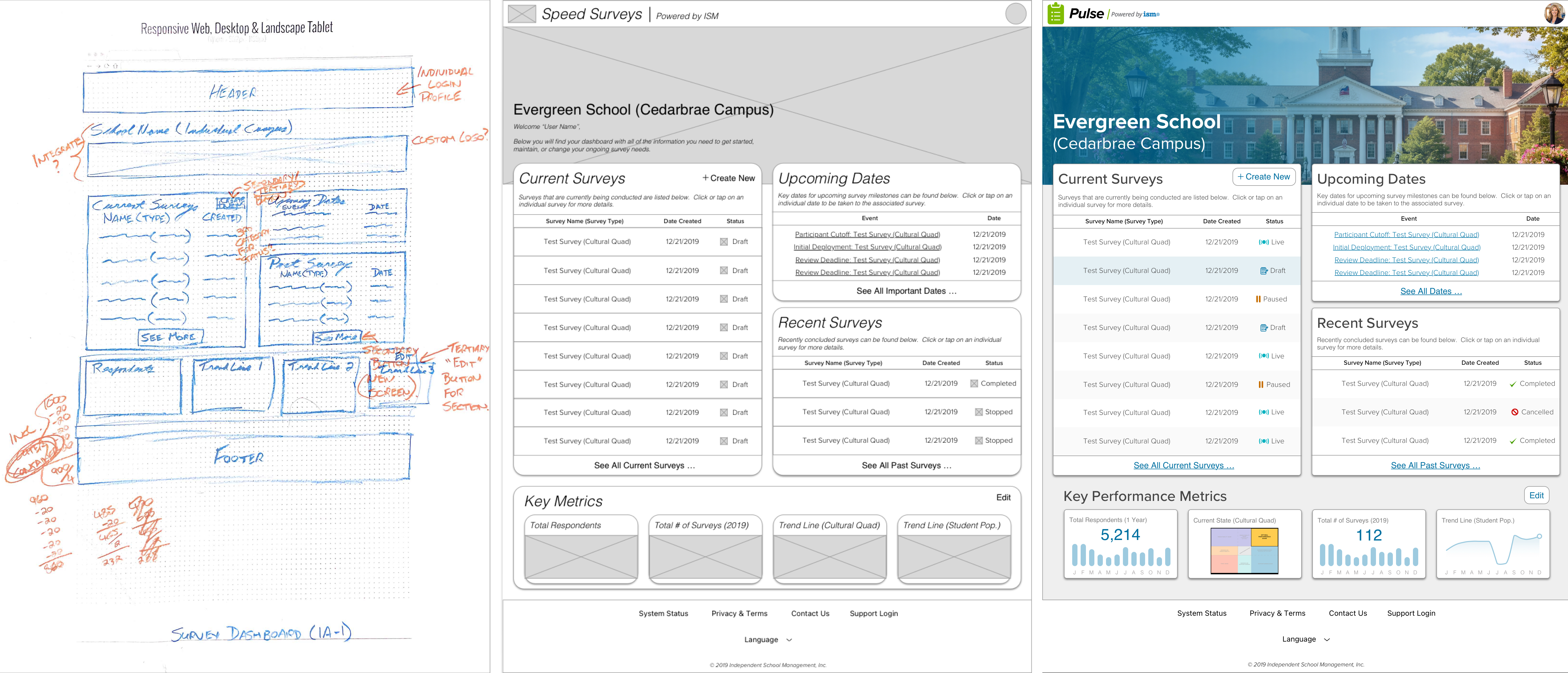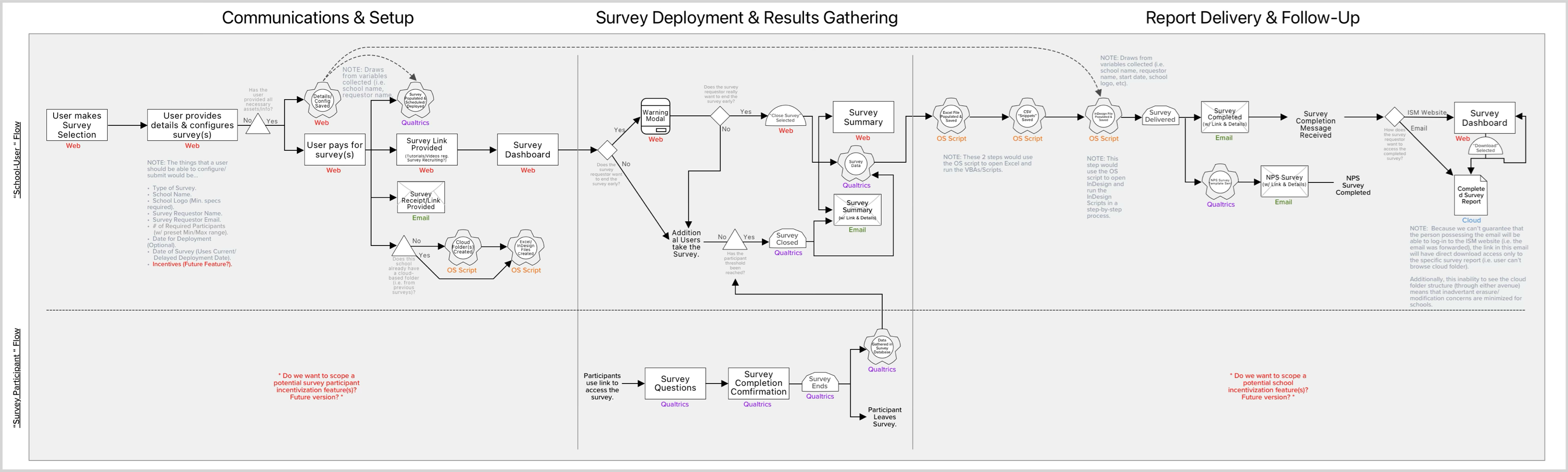 Comprised of differing functionalities that would serve different audiences (i.e. school professionals deploying surveys, survey recipients completing them, and members of the ISM Survey Team referencing them on occasion), the service ecosystem needed to present all of these capabilities in a simple front-end interface that was powerful and easy to use.