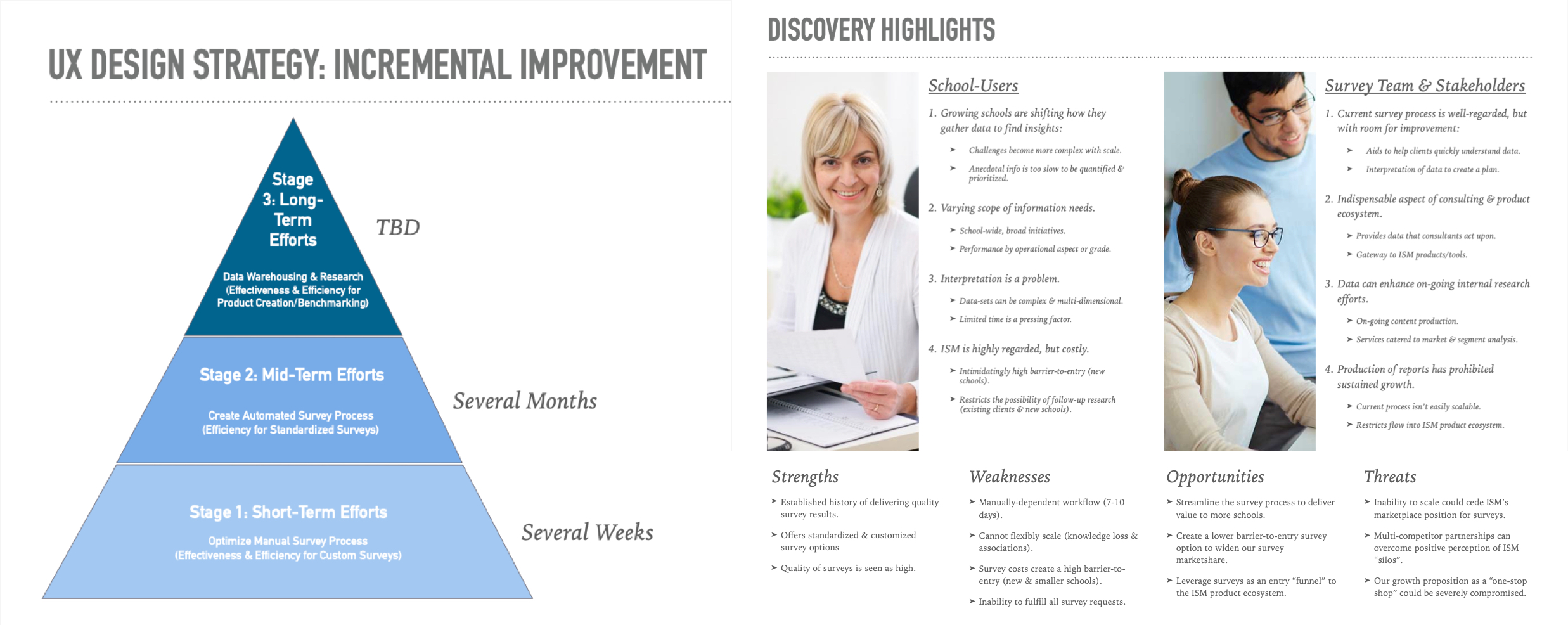 Comprised of differing functionalities that would serve different audiences (i.e. school professionals deploying surveys, survey recipients completing them, and members of the ISM Survey Team referencing them on occasion), the service ecosystem needed to present all of these capabilities in a simple front-end interface that was powerful and easy to use.